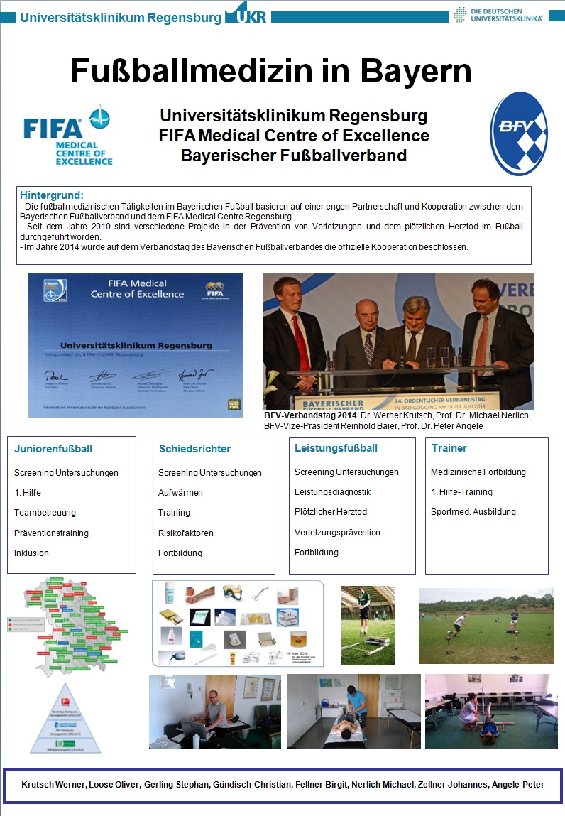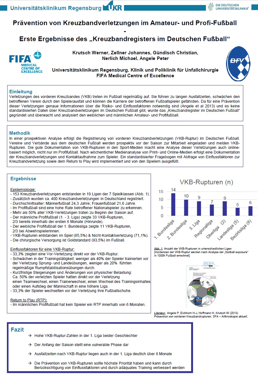 | 05/2018 | Poster beim Deutschen Olympischen Sportärztekongress 2018(Hamburg): 1) Screening-Untersuchungen in Nachwuchsleistungszentren des BFV – Wer sucht der findet?!: Gündisch C, Gerling S, Loose O, Krutsch V, Krutsch W 2) To Prevent SCD in Junior Soccer Players: Screening For Coronary Abnormalities By Echocardiography: Gerling S, Melter M, Michel H, Gündisch C, Loose O, Krutsch W 3) Vorsorgeuntersuchungen im Juniorenleistungsfußball: Gerling S, Lehner L, Gündisch C, Melter M, Loose O, Krutsch W 4) Kreuzbandregister im Deutschen Fußball - Analyse von 19 Ligen im Amateur- und Profifußballs: Krutsch W, Zellner J, Loose O, Achenbach L, Nerlich M, Krutsch V, Gündisch C, Angele P |